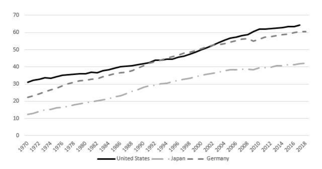 Figure 1: GDP per Hour Worked in Japan, Germany, and the United States, 1970-2018